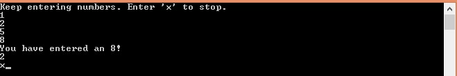 Console.WriteLine("Keep entering numbers. Enter 'x' to stop.");