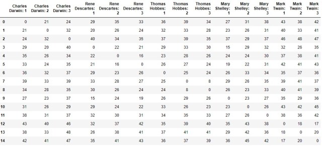 dfchiSquaredDistances = pd.DataFrame(data=np.round(chiSquaredDistances*100).astype(int), columns=authorSamples)