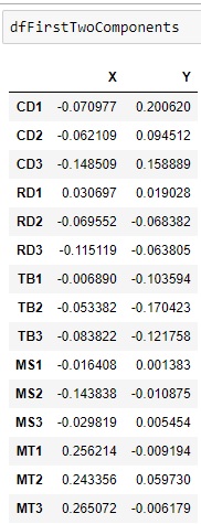 deltaR = np.diag(np.divide(1.0,np.sqrt(rowTotals))) rowScores=np.dot(np.dot(deltaR,u),np.diag(s)) dfFirstTwoComponents = pd.DataFrame(data=[l[0:2] for l in rowScores], columns=['X', 'Y'], index=initials) print(dfFirstTwoComponents)